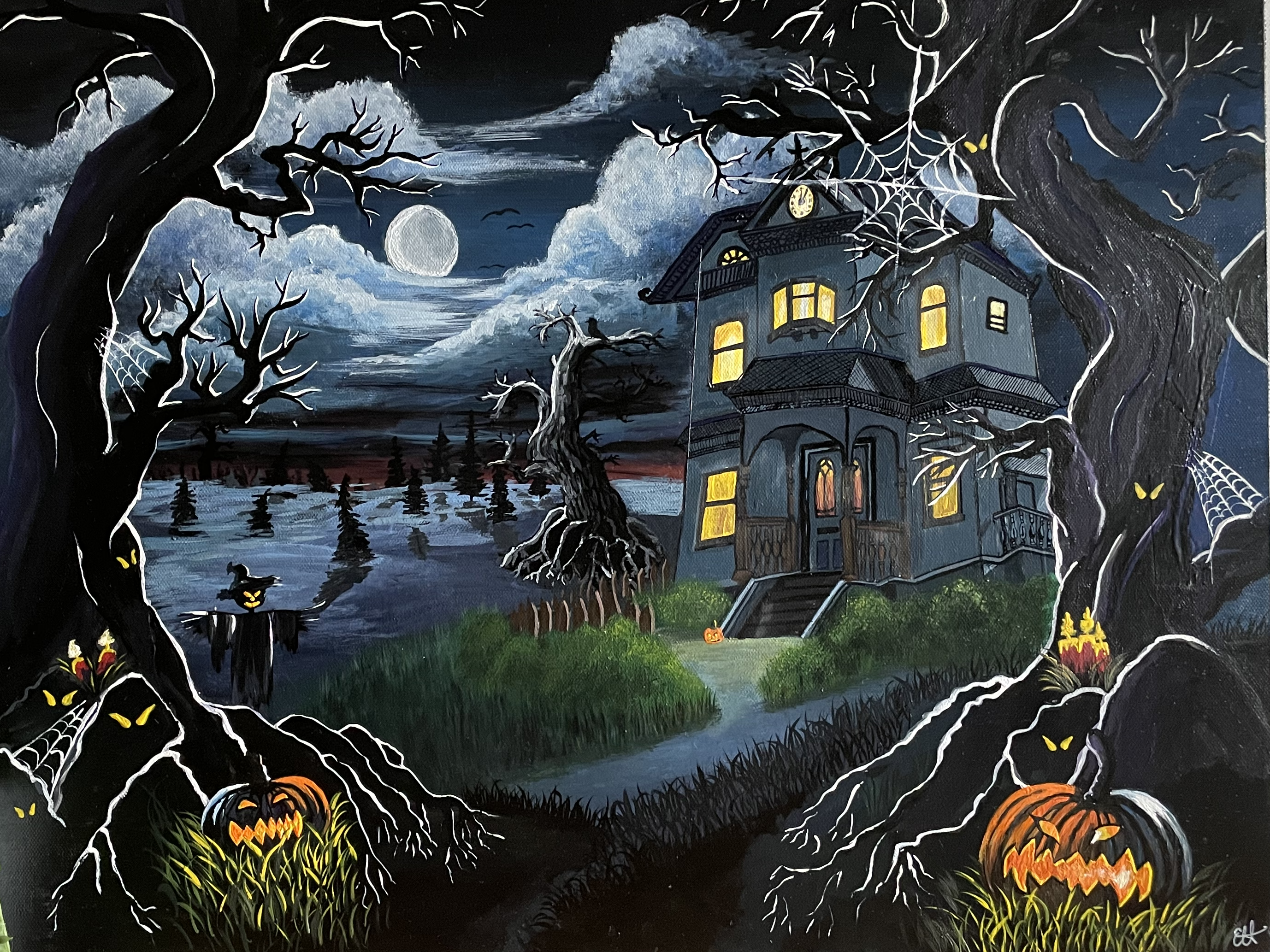 I’ve been sketching, drawing, and painting ever since I was 12 years old. Inspired by my sister who is a graphic designer, I’ve always had an appreciation for beauty. Just as life unfolds its narratives, I found joy in the ability to transform an empty canvas. My most recent work was this acrylic piece made before a certain holiday.. can you guess what it is?